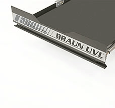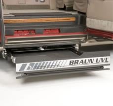 The BraunAbility UVL Series mobility lifts are electric in operation for both the in/out cycle and the outboard roll stop. The up/down cycle is hydraulic in operation. All functions are controlled by the standard hand-held control or the optional remote control.